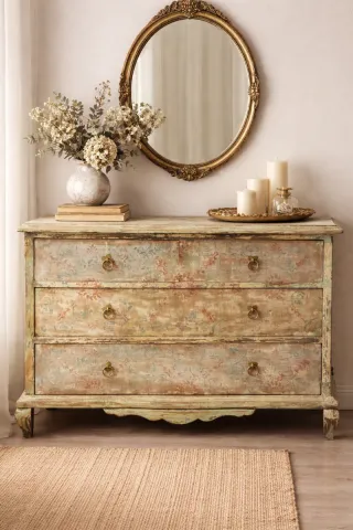 Cómoda antigua de estilo provenzal shabby chic Esta preciosa cómoda destaca por su encanto artesanal y carácter único. Restaurada con una delicada técnica de pátina envejecida, combina tonos suaves en verde salvia, crema y matices empolvados que le aportan profundidad y calidez. Los frontales decorados con motivos florales sutiles refuerzan su aire romántico, mientras que los tiradores de anilla en latón añaden un toque clásico y elegante. Su silueta curvada y las patas estilizadas evocan el estilo provenzal francés, convirtiéndola en una pieza con gran presencia sin resultar recargada. Perfecta para dormitorio, salón, hall.