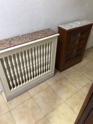 Conjunto de muebles para radiador con acabados de mármol y madera. - Diseño elegante que combina a la perfección con la decoración. - Cubierta superior de mármol veteado. - Estructura de madera con detalles decorativos. - MEDIDAS: Blanco: ancho 88cm X 82cm alto Marrón: ancho 63cm X 84cm alto