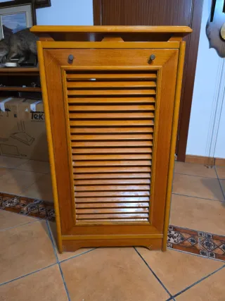 Mueble cubreradiador de madera con un acabado brillante y diseño de lamas. - Diseño de lamas. - Acabado en madera clara. Tiene una esquina golpeada ...por lo demás está como nuevo