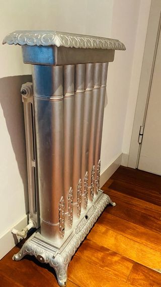 Radiador antiguo con un diseño decorativo y elegante. Su acabado le da un toque clásico a cualquier espacio. - Estructura de metal con un acabado plateado. - Diseño con múltiples columnas verticales. - Base ornamentada con detalles. - Parte superior con un borde decorativo.