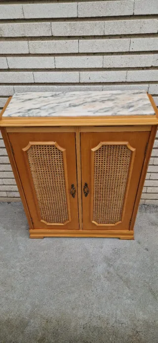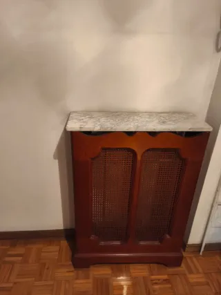 Elegante cubre radiador con un diseño clásico. - Encimera de mármol con veteado. - Frontal con detalles de rejilla de ratán. - Estructura principal de madera.