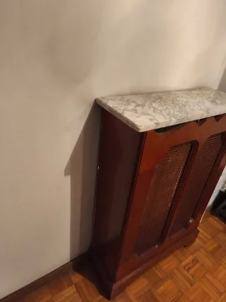 Estantería tipo cubre radiador de madera con tapa de mármol y rejilla de ratán, dividida por dos baldas.
