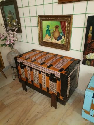 Precioso baúl o cofre antiguo... De los que las abuelas llevaban para ajuar. Está muy bien conservado ya que se ha restaurado respetando sus colores y piezas originales. Le hemos puesto dos soportes para baules muy antiguos que le quedan de maravilla, aunque no son idénticos, ambos también están hechos a mano. El baúl mide 90 x 47 y con los soportes llega a tener una altura de 62 cm. Sin ellos 49 cm. Al ser una pieza antigua y única preferimos no enviar, aunque se puede transportar según distancia o recoger nuestra tienda en Colmenar de Oreja. Mejor consultar.