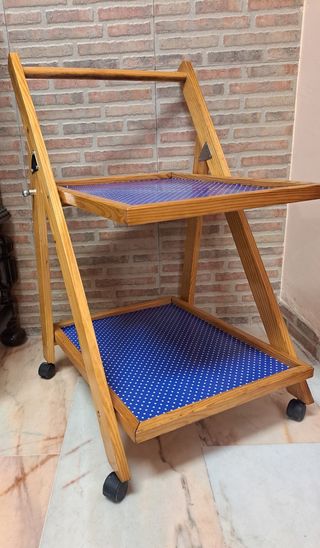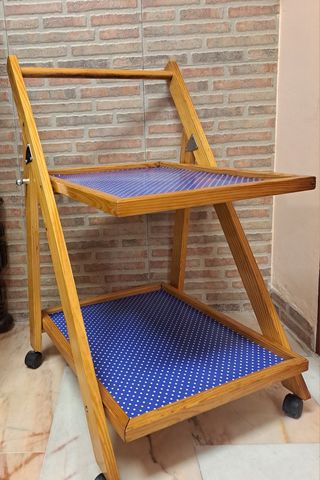 Práctico carrito que hace las veces de camarera ya que lleva ruedas para poderlo llevar de una estancia a otra con comodidad. Tiene dos bandejas para aprovechar su espacio. Se puede plegar y guardarlo en pequeños espacios. Ha sido recuperado y restaurado para que dure mucho tiempo. Está en perfecto estado. Se puede enviar o recoger en nuestra tienda en Colmenar de Oreja.