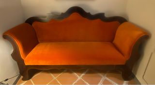 Elegante sofá de estilo Isabelino, restaurado con esmero. - Tapicería de terciopelo en vibrante color naranja. - Estructura de madera tallada con detalles ornamentales. - Diseño curvo y acogedor. Estil clàssic. • Estructura: fusta massissa amb formes ondulades i braços corbats que es prolonguen cap al respatller, evocant línies de peces del segle XIX o principis del XX. • Tapisseria nova: vellut (o microvellut) d’un color viu taronja/teula que li dona un caràctec de peça vintage. Fort impacte estètic