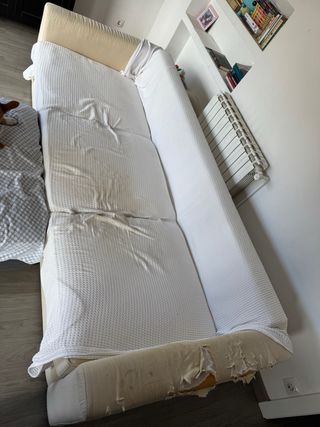 Sofá con desgaste generalizado (ver fotos). Estructura firme y usable, ideal para tapizar o proyecto DIY. Precio simbólico porque necesitamos retirarlo a FINALES DE ABRIL. Quien venga primero se lo lleva 🙂. El sofa se encuentra en la Vall d’hebron! Medidas: 242 cm alto x 95 cm ancho.