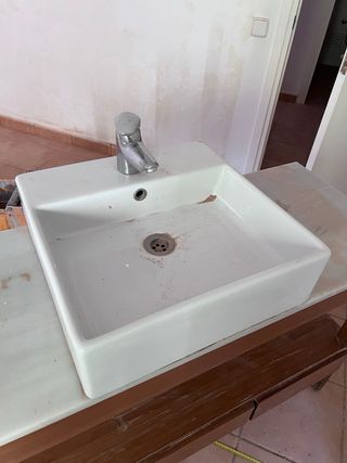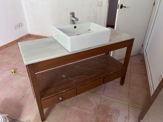 Mueble de baño con lavabo de cerámica y encimera de mármol. - Estructura de madera. - Tres cajones. - Estante inferior. Estado no muy bueno. Se puede restaurar mueble y aprovechar el lavabo y el grifo Roca. Medidas lavamanos 46cm ancho x 46cm profundo Solo se acepts recogida en Teià
