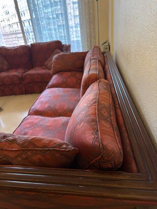 Sofá de dos plazas con un diseño clásico y elegante, perfecto para darle un toque vintage a tu hogar. Su tapicería presenta un estampado geométrico en tonos rojos y marrones. - Diseño de dos plazas. - Tapicería con estampado geométrico. - Ideal para proyectos de restauración. Tiene signos visibles de uso y desgaste propios de los años (ver fotos), por lo que es ideal para restaurar, retapizar o usar tal cual en una casa de campo, trastero, local o segunda vivienda. Precio negociable Transporte a cargo del comprador