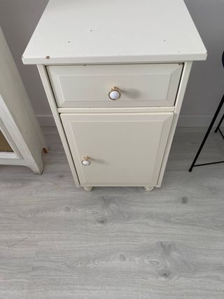 Mesita de noche blanca con un diseño encantador. Ideal para añadir un toque de estilo a tu habitacin. Mesita de noche restaurada, la he pintado blanca a mano y le he puesto tiradores plateados nuevos. Mide 50 x 39 cm. Alto 53 cm. Te la envío. Más artículos en mi perfil 😊.