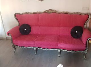 Sofá isabelino restaurado en color rosa fucsia el tapizado, y la estructura en plateado envejecido con rivete negro. Medidas: 2 metros de largo y 75cm de fondo.