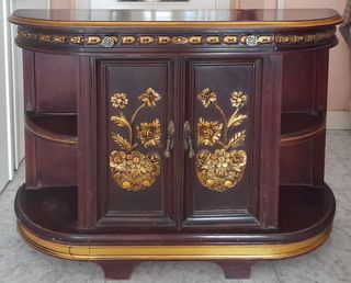 Preciosa entradita vintage con motivos vegetales decorados en oro. Consta de un cajón central y un compartimento inferior de dos puertas que da acceso a dos estantes. Un doble estante externo, a ambos lados, permite colocar objetos decorativos a gusto de cada cual. Sus formas redondeadas le otorgan un especial atractivo a la vez que tienen una función ergonómica, sin aristas que puedan lastimarnos. Mueble restaurado. Medidas: 100 cm de ancho x 78 cm de alto x 27 cm de fondo. RECOGIDA EN ORIGEN O GASTOS DE ENVÍO A CARGO DEL COMPRADOR.