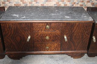 Cómoda y mesitas de dormitorio muy antiguas, en muy buen estado, recién restauradas. Medidas mesitas: alto 59cm, ancho 54cm y fondo 38cm Medidas cómoda: alto 63cm, ancho, 113cm y fondo 48cm
