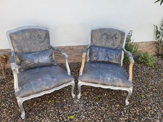 Elegantes sillones de estilo vintage, perfectos para añadir un toque clásico a tu hogar. Se venden juntos 80€ O por separado 50€. - Diseño con tapicería de tela y detalles en madera. - Color gris y plateado con un patrón decorativo. - Incluye cojín decorativo a juego. Restaurados. Uno medio empezado a lijar de nuevo.