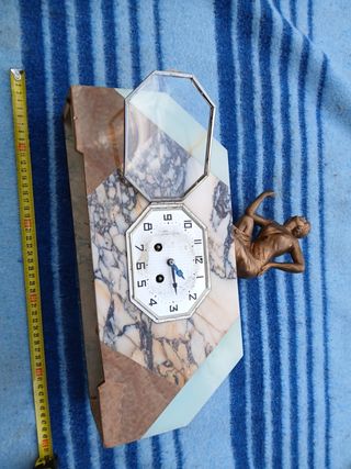 Precioso reloj de sobremesa estilo Art Déco con una figura femenina. - Base de mármol con diseño geométrico. - Figura decorativa de metal. - Requiere restauración. Reloj para restaurar, se entrega sin llave . Desconozco si le falta alguna pieza, ver fotos. Le.falta el pendulo