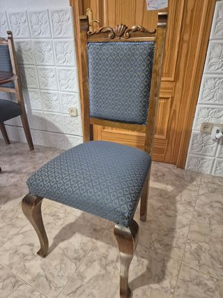 Juego de 4 sillas de comedor de madera tapizadas en tono azul. Madera maciza y resistente. Amortiguacion de la base muy buena. El forro del bajo esta un poco deteriorado pero es fácil reemplazarlo. Muy estables. Perfectas también si las quieres restaurar o pintar de algún color. No se venden sueltas. 70€ las 4 unidades