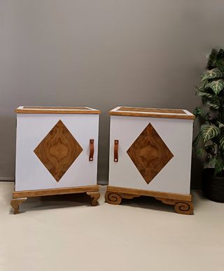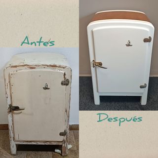 Conjunto de dos mesitas de noche con un diseño vintage. Antiguas mesitas de madera restauradas, puedes volver a pintarlas y dejarlas a tu gusto. Comoda, mueble, aparador, sinfonier, decoración, mesillas, Ikea, Maison du monde, Leroy Merlin, Sklum. - Acabado en rojo y blanco con detalles desgastados. - Patas curvas elegantes. - Tiradores decorativos. Se pueden recoger en Logroño zona Los Lirios o en Burgos ciudad.