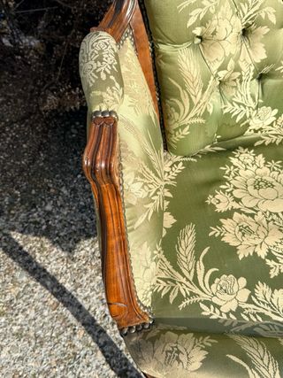 completamente restaurada y tapizada por tapicero profesional. muy antigua. buen estado. buena calidad. queda bien en cualquier rincón. cojín a juego de regalo.