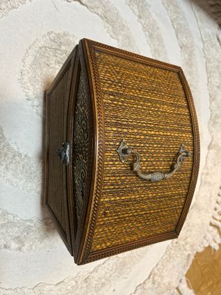 Precioso cofre de madera con detalles dorados, totalmente restaurado. Su diseño intrincado le da un toque único. - Acabado con patrón tejido. - Bordes decorados con pequeños detalles. - Cierre metálico decorativo.