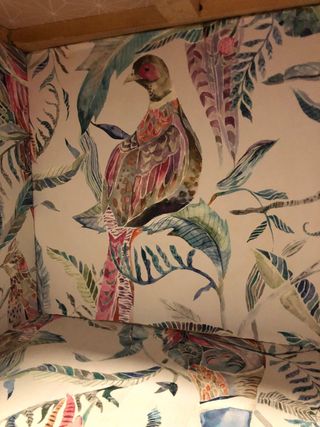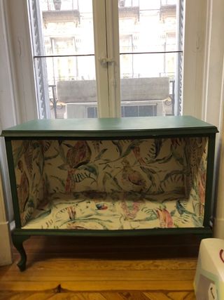 Mueble restaurado con un diseño único y llamativo. - Interior forrado con tela de aves y hojas. - Patas curvas de madera. - Acabado exterior en color verde.