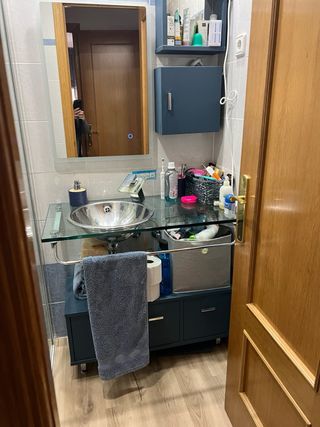 Mueble de baño moderno con un acabado restaurado en color azul 90 cm. Encimera de cristal y lavabo metal. Grifo cascada - Diseño contemporáneo. - Estructura de madera. - Tiradores metálicos.