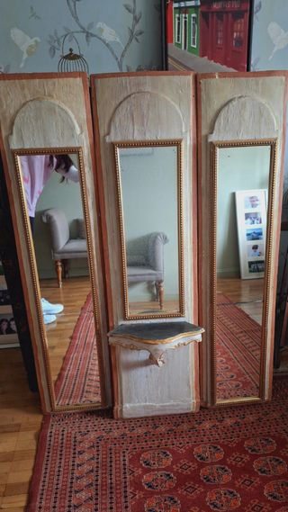 Elegante espejo tríptico con un diseño antiguo y restaurado. Cada panel presenta un marco con detalles rosaceos y un acabado texturizado en tonos grisaceos . - Marco exterior con acabado en un vivo en rosaceo antiguo . - Cada panel con su espejo enmarcado por un marco estrecho dorado. - Incluye una pequeña repisa central rematada en dorado..