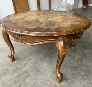 Mesa de centro con un diseño clásico, ideal para proyectos de restauración. Su estructura de madera ofrece una base sólida para renovar. - Diseño con patas curvas. - Detalles ornamentales en el faldón.