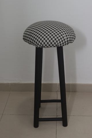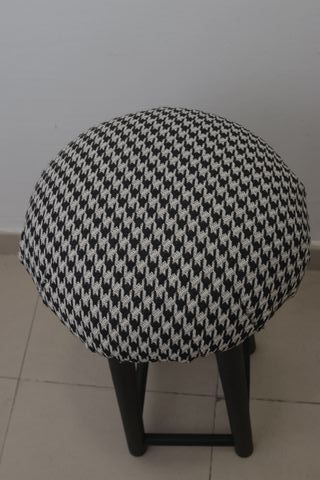 Taburete alto restaurado y pintado en negro mate, tapizado con tela negra y blanca de pata de gallo, ideal para cualquier espacio. Hecho en nuestro taller - Tapizado con un patrón distintivo. - Estructura de madera. - Patas negras. - Tapizado con espuma de alta densidad que lo hace comodísimo SOLO VENTA EN PERSONA EN LAMZONA DEL RASTRO DE MADRID HASTA EL 13 DE FEBRERO.