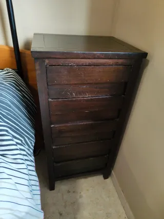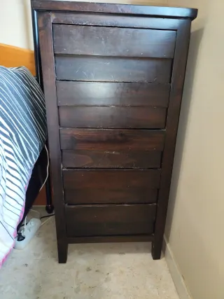 Cajonera de madera con cinco cajones, ideal para organizar tu espacio. - Diseño de cinco cajones. - Acabado en madera oscura. Evidentes signos de su uso. Ideal para alguien que la sepa restaurar o le guste tan y como está Medidas: 45 ancho x 36 fondo x 94 alto