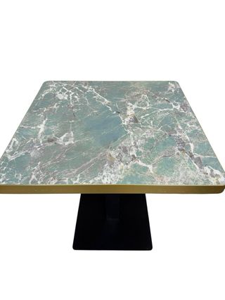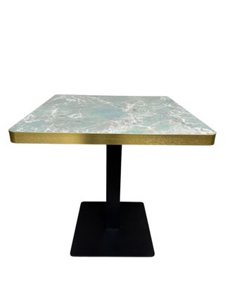Elegante mesa con superficie de piedra sintetizada que imita el mármol en tonos verde agua. Su diseño se complementa con un borde metálico en acabado dorado. - Tablero con efecto mármol verde agua. - Borde metálico dorado. - Tablero de 4cm - Base metálica negra, oro, negra y oro, plata.. En varias medidas.. Desde 120€ Todos nuestros precios son +IVA. Tenemos catalogo y un showroom ubicado en sabadell donde atendemos con cita previa. HACEMOS ENVIOS POR TODA ESPAÑA. palabras clave: sofá hosteleria, sofá restaurante, sofá discoteca, sofá a medida, hosteleria segunda mano, mobiliario segunda mano, mesas hosteleria