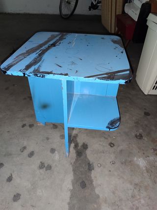 Mesa auxiliar cuadrada de madera, color azul. Tiene una balda. Presenta marcas de pintura negra. Ideal para restaurar.