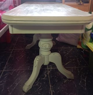Mesa elevable tipo libro vintage restaurada, completamente única, pintada de verde celeste con espectacular detalle interior al abrir la mesa de una carta escrita, no encontrarás otra igual, muy original, vendo por falta de espacio. Precio algo negociable, venta preferiblemente en mano en Aguilar de Campoo, Torrelavega o Palencia, o cercanías.