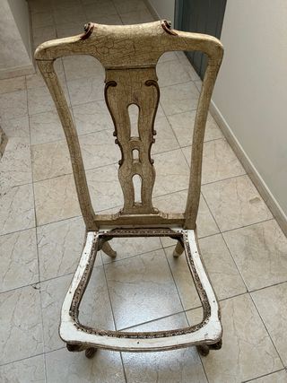 Preciosa silla antigua de madera del siglo XVIII, de estilo Rococó. La compré en una feria de antiguedades.Está para restaurar,pero tiene una estructura fuerte y firme.La madera está sana,no tiene carcoma.Restaurada llamará la atención,tiene mucha presencia. - Altura total: 110 cm - Ancho del asiento: 50 cm - Profundidad del asiento: 40 cm - Altura del asiento: 45 cm