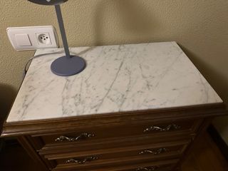 Pequeña mesita de noche con un diseño retro y elegante. Ideal para añadir un toque vintage a tu habitación. - Tres cajones con tiradores ornamentados. - Acabado en madera con detalles tallados.