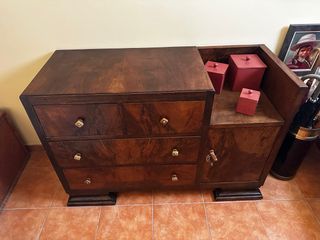 Mueble de comedor de estilo retro, con un diseño clásico y funcional. - Acabado en madera oscura. - Detalles dorados en los tiradores. - Incluye una cama abatible integrada.