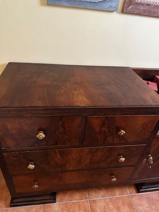 Cama de estilo clásico-colchon 135cm. Pieza de alta calidad con un trabajo de madera excepcional. Ideal para dormitorios vintage, retro, shabby chic o casa rural. Materiales: Chapa de raiz de nogal, vetas naturales vistosas. Detalles: Marqueteria central con motivos florales y tallas en relieve. Estado: En buen estado, mantiene su brillo y los detalles están intactos.Pieza robusta y sólida. Incluye: Cabecero, pié de cama y travesaños. REGALO el colchón y somier. Medidas: La cama mide de alto 130, de ancho en los pies 140 y en el cabecero 157. Cama completa lista para usar. Disponible juego:armario,cómoda,etc.