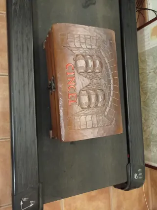 Baúl antiguo con un diseño grabado. - Tapa con relieve de barriles. - Inscripción GINCEL en rojo.