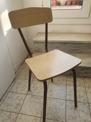Silla de estilo retro y vintage, con un diseño que evoca épocas pasadas. Aporta un toque distintivo a cualquier espacio. Altura de la base hacia el asiento 46cm - Patas y estructura de metal. - Asiento y respaldo de madera con acabado veteado.