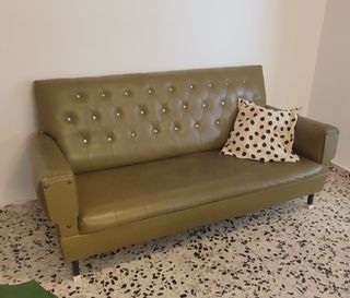 Se vende sofá vintage de estilo clásico, en buen estado de conservación, expectuando el roce que se aprecia en la ultima foto. Tapizado en color verde oliva, con detalles de tachuelas plateadas en el respaldo. Medidas: Largo: 175 cm; Profundidad: 80 cm; Altura: 82 cm Ideal para decorar espacios con un aire retro o dar personalidad a tu salón. Robusto, cómodo y con un diseño atemporal. Perfecto para los amantes de lo vintage. Posibilidad de entrega en mano en la zona. ¡No dudes en preguntar!