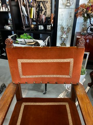 Sillón frailero de estilo renacentista, una pieza clásica con gran presencia y carácter. Ideal para despachos, salones de estilo rústico o como pieza de acento en decoraciones eclécticas. Estructura robusta en madera de nogal con hermosos detalles tallados a mano en el copete y el fiador delantero. Asiento y respaldo tapizados en terciopelo color teja/terracota, rematados con pasamanería bordada en hilo dorado/beige y tachuelas de bronce originales que le aportan un aire distinguido. Cuenta con los icónicos apoyabrazos anchos y planos típicos de este modelo español. Muy bien conservado para su antigüedad. La estructura es sólida