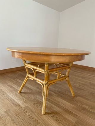Mesa redonda extensible. 6 sillas de bambu y enea.