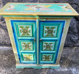 MUEBLE VINTAGE DE 2 PUERTAS EN MADERA DE SESAMO PINTADO A MANO. MATERIAL: SESAMO. COLOR: MULTICOLOR. MEDIDAS: 95cm alto x 73cm ancho x 32cm fondo. Mantenimiento: Limpiar con un paño húmedo. No utilizar productos abrasivos.