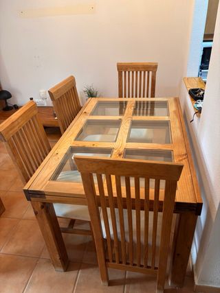 Conjunto de mesa de comedor y sillas de madera maciza de pino con un estilo rústico. - Mesa con sobre de cristal. - Sillas con respaldo de listones. - Medidas: 90cm de ancho, 140cm de largo, extendida llega hasta 2,80 y 77cm de alto. La mesa se encuentra en muy buen estado. Las sillas necesitan tapizado nuevo y encolarlas.