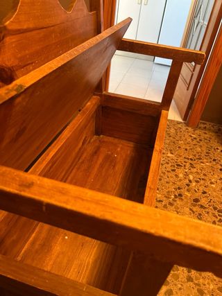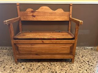 Banco de madera mexicana. Ideal para añadir un toque rústico a tu hogar. - Fabricado en madera maciza. - Respaldo curvo decorativo. - Asiento con tapa abatible para almacenamiento.