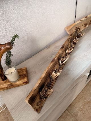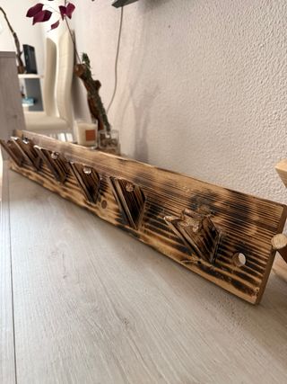 Perchero de madera con un diseño rústico y artesanal. Ideal para dar un toque natural a tu hogar. - Fabricado a mano. - Acabado quemado que resalta la veta de la madera. - Cuenta con varios ganchos para colgar. - Incluye un agujero para su fijación a la pared.