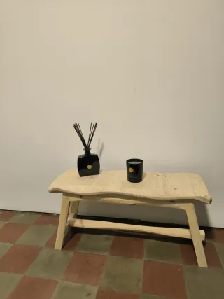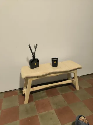 Mesa de madera con un diseño rústico y natural. Sus vetas y nudos le dan un carácter único. - Acabado en madera clara. - Patas robustas. Material: Pino Acabado: Natural Medidas aprox Largo 70 x Ancho 3 8x Alto 40 cm Proyectos a medida: + 5€ (Planos) Barnizado/Lasur +5€ La madera es un material natural por lo que tiene nudos, vetas y alineaciones propias de la madera. (El pino alistonado da lugar a que la tabla no esté totalmente plana) Al pintar con tono incoloro se oscurece por la exposición a la luz. El peso puede variar una vez finalizado el proyecto. 10Kg - 55€ AL Ref.: 090326001