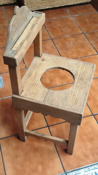 Pieza antigua de madera con un diseño rústico. Para almacenar y dejar el cántaro. Es como si fuera una silla pero el respaldo un poco más bajo. La altura total son 85 Cms. - Asiento con abertura circular. - Respaldo curvo con detalles decorativos. - Patas robustas. Más cosillas muy variadas e interesantes en mi perfil ANTIGÜEDADES, LIBROS CÓMIC, LITOGRAFÍAS , LÁMINAS, POSTALES, REGIGIOSO, CROMOS, Etc...