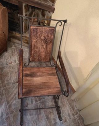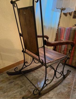 Preciosa mecedora de hierro forjado y madera maciza. Muy resistente, estable y cómoda. Diseño rústico decorativo ideal para salón, chimenea o casa de campo. Se encuentra en buen estado, lista para usar. 📍 Solo recogida en mano en Palencia por tamaño y peso.