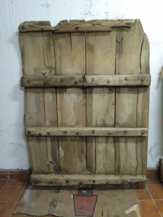 Trillo antiguo de madera, ideal para decoración rústica o como pieza de colección. - Construcción robusta con tablones de madera. - Reforzado con travesaños y clavos metálicos.