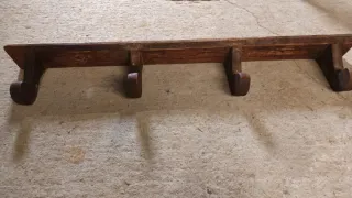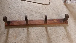 perchero antiguo de madera con un diseño antiguo y rústico. D los d antes. Ideal para proyecto restautacion decoracion.... sta tratado se ve en las fotos, a espensa d barniz cera.....80 cm d largo - Cuatro ganchos para colgar. - Fabricado en madera oscura.