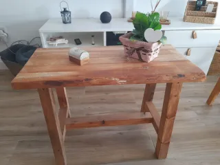 Preciosa mesa de madera de estilo rústico. Es perfecta para desayunos en la cocina, o para el salón! - Medidas: 160cm de largox105cm alto. - 45cm fondo y 5cm grosor. - Acabado natural de la madera. - Barnizada en color roble medio. - Posibilidad de envío a casa! -Las hago por encargo! Escríbeme ✅️